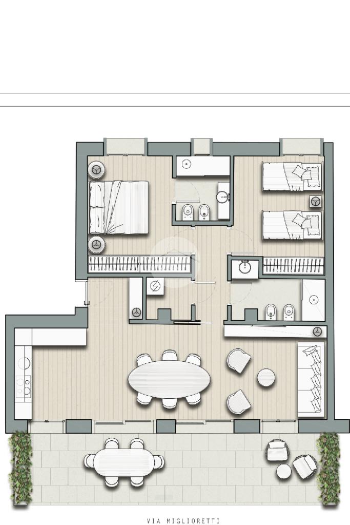 Appartamento è luminoso con doppia esposizione sulla tranquilla corte interna, spazi ottimizzati e composti da un luminoso soggiorno con cucina a vista e accesso a un grande terrazzo abitabile, 2 camere da letto matrimoniali e 2 bagni di cui uno en-suite, lavanderia.