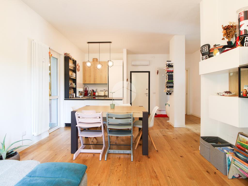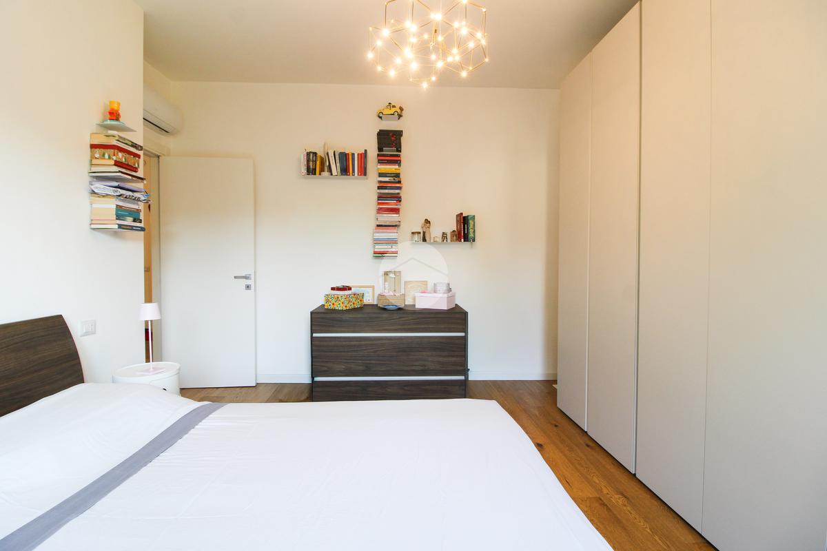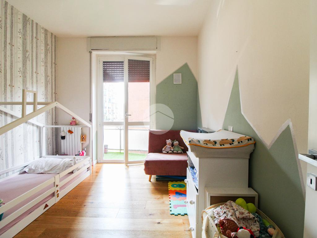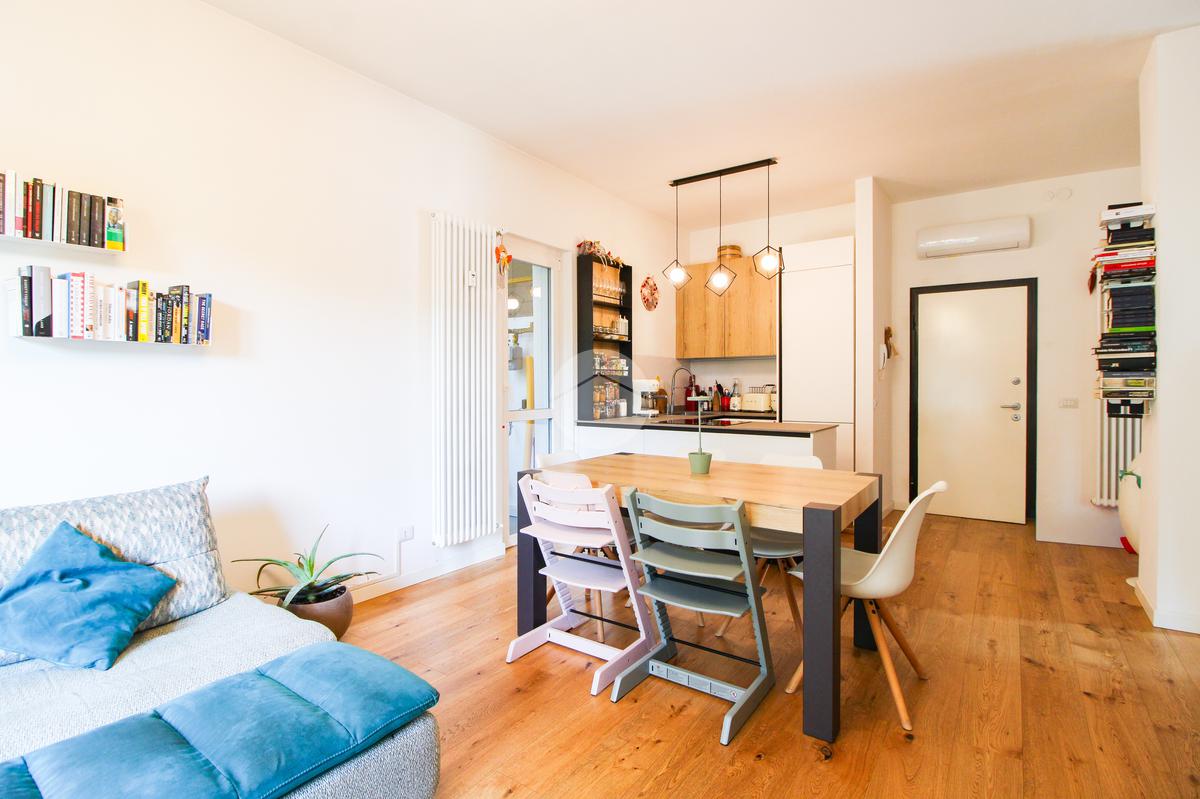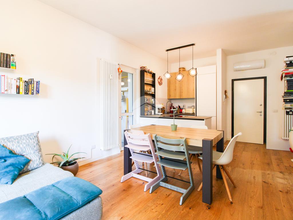 L’appartamento gode di doppia esposizione ed è composto da ingresso, luminoso soggiorno con cucina a vista e balcone, camera matrimoniale, camera singola con balcone, bagno finestrato con doccia, ripostiglio e veranda coperta ad uso esclusivo. Completa la proprietà una cantina di pertinenza.