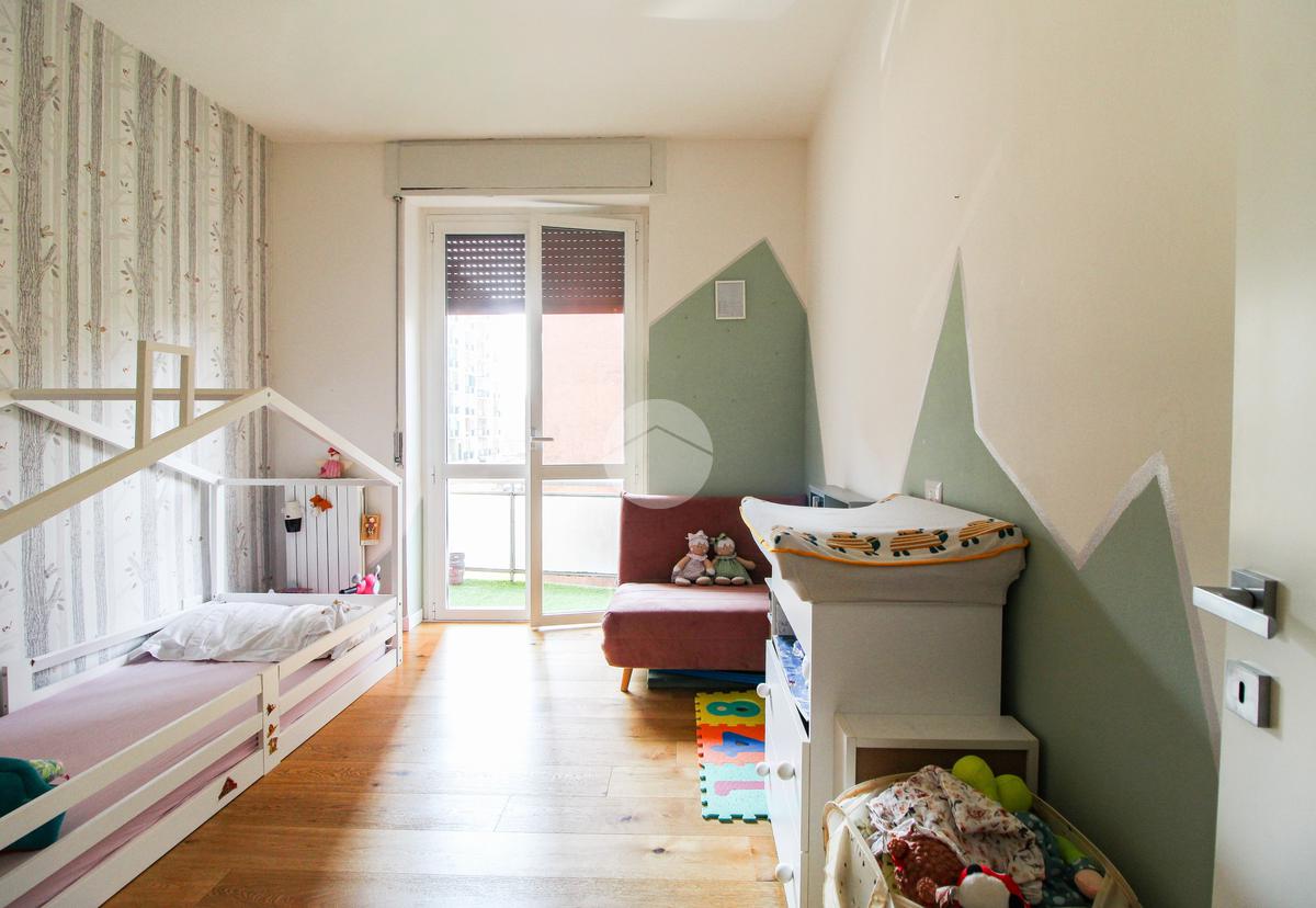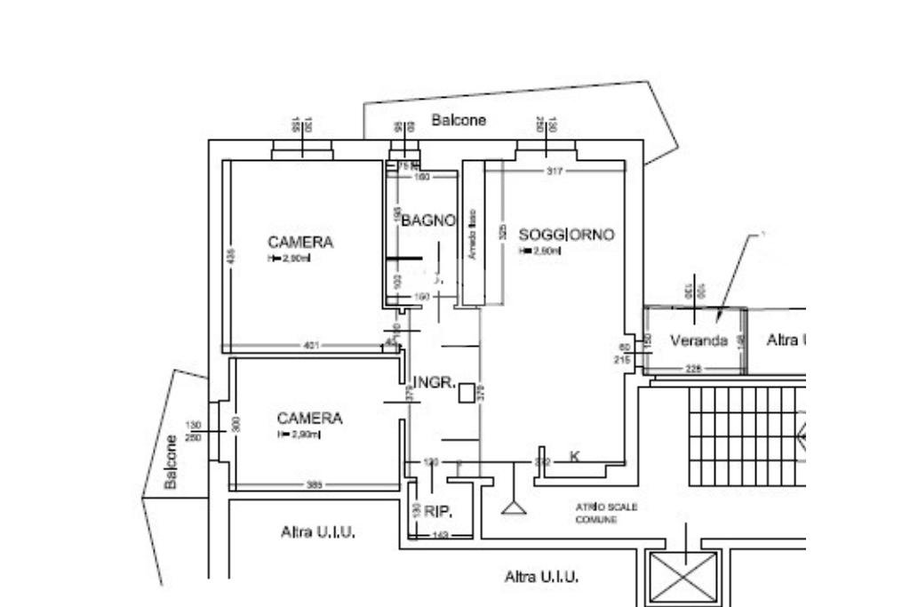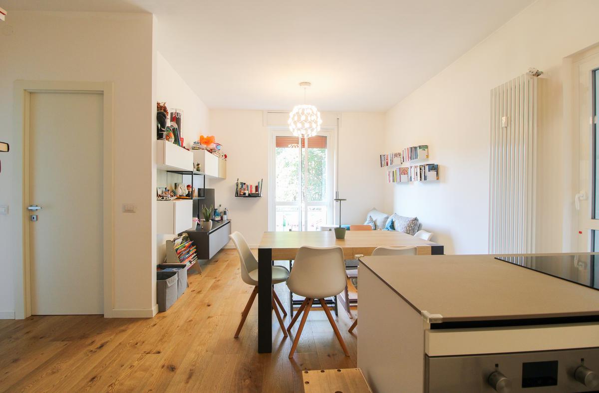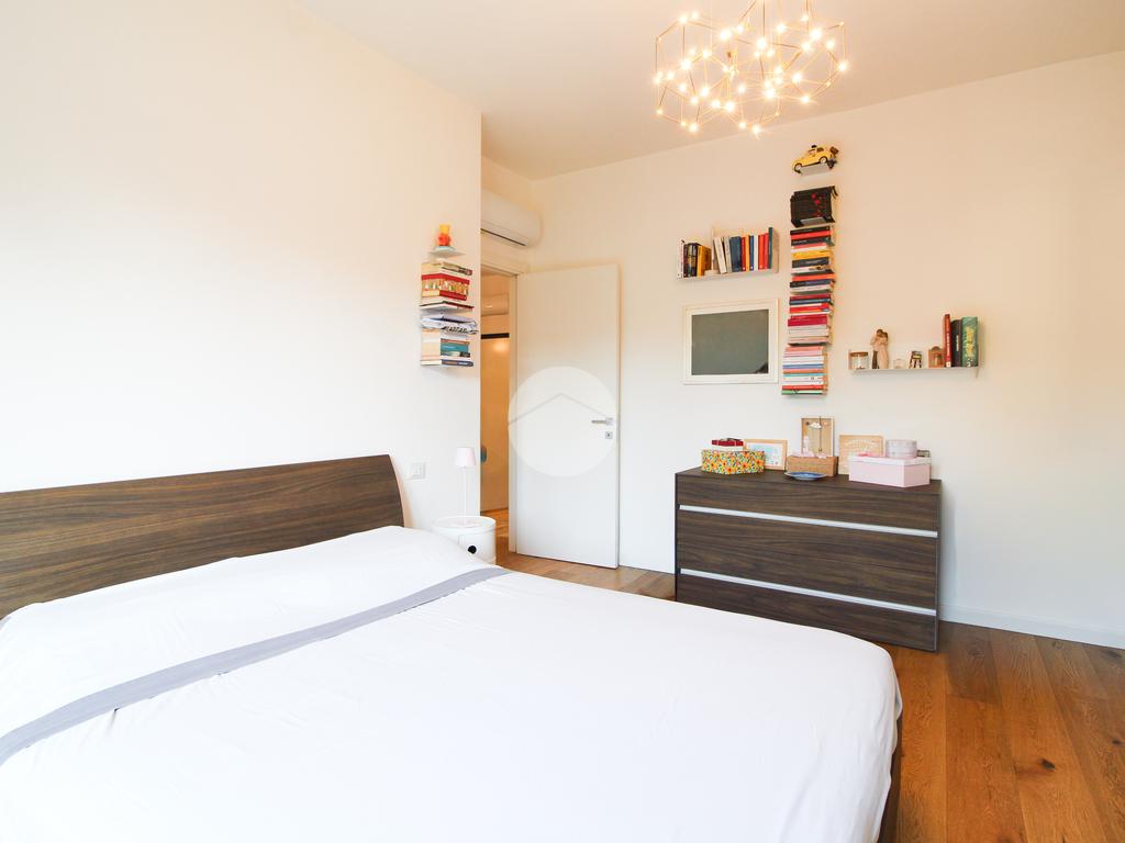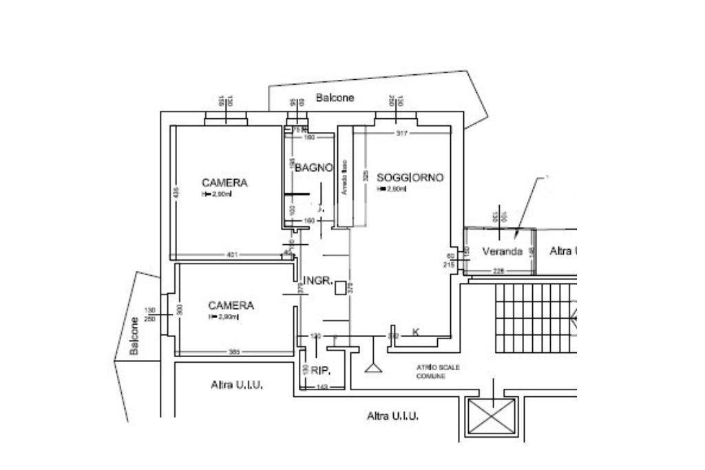 L’appartamento gode di doppia esposizione ed è composto da ingresso, luminoso soggiorno con cucina a vista e balcone, camera matrimoniale, camera singola con balcone, bagno finestrato con doccia, ripostiglio e veranda coperta ad uso esclusivo. Completa la proprietà una cantina di pertinenza.