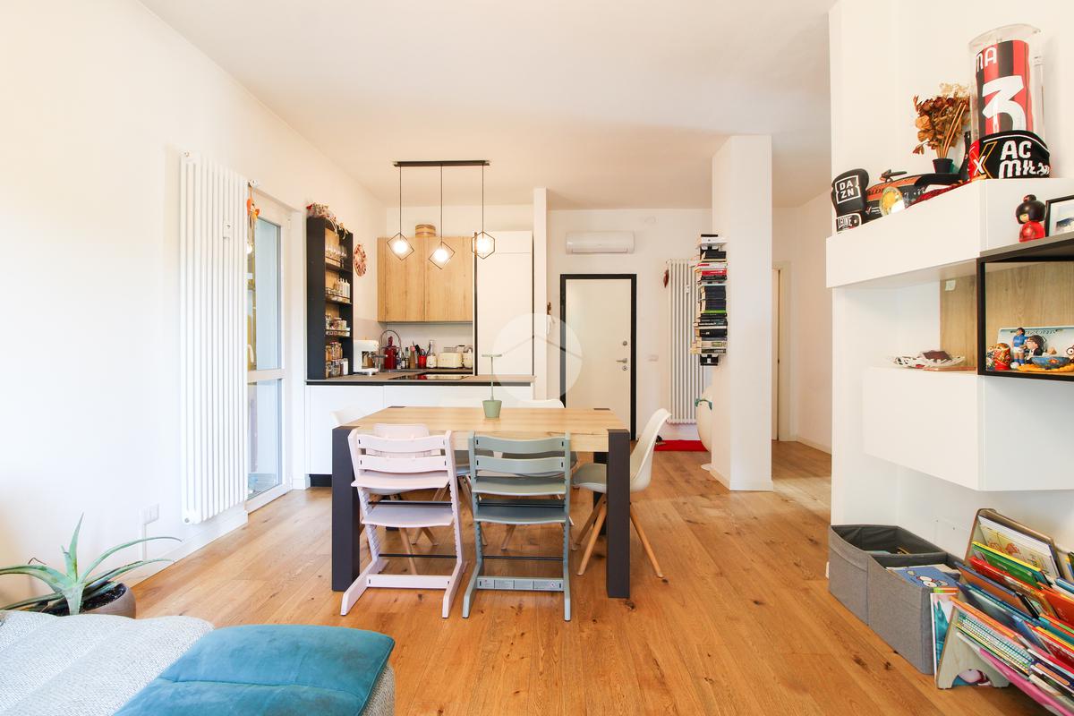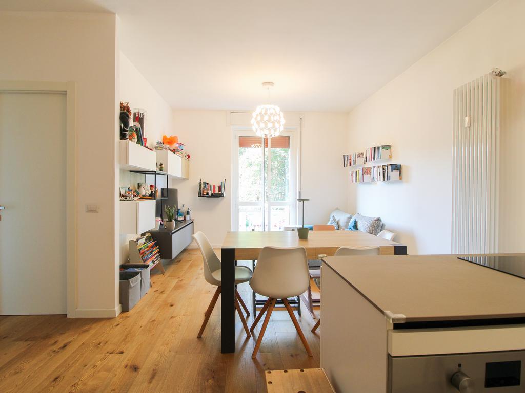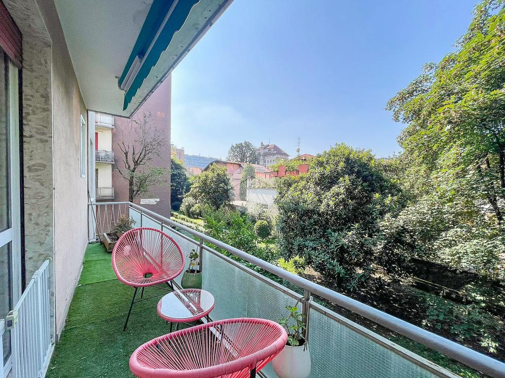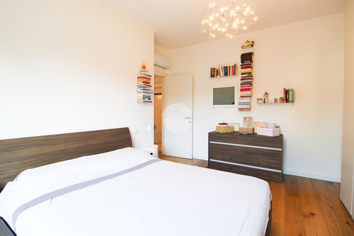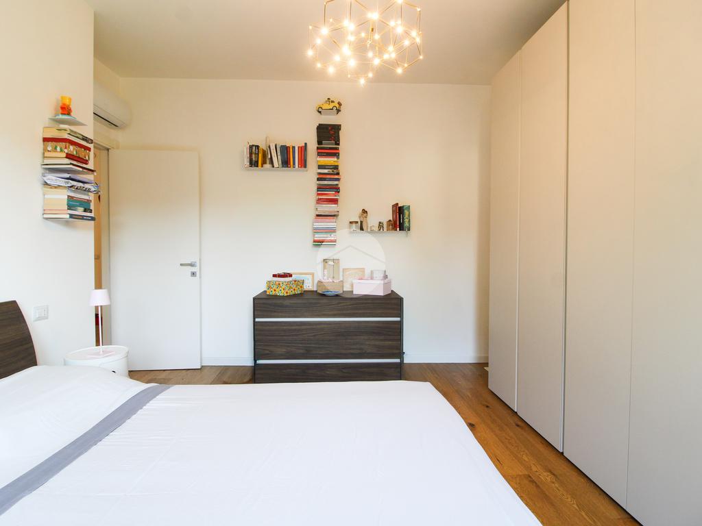 L’appartamento gode di doppia esposizione ed è composto da ingresso, luminoso soggiorno con cucina a vista e balcone, camera matrimoniale, camera singola con balcone, bagno finestrato con doccia, ripostiglio e veranda coperta ad uso esclusivo. Completa la proprietà una cantina di pertinenza.