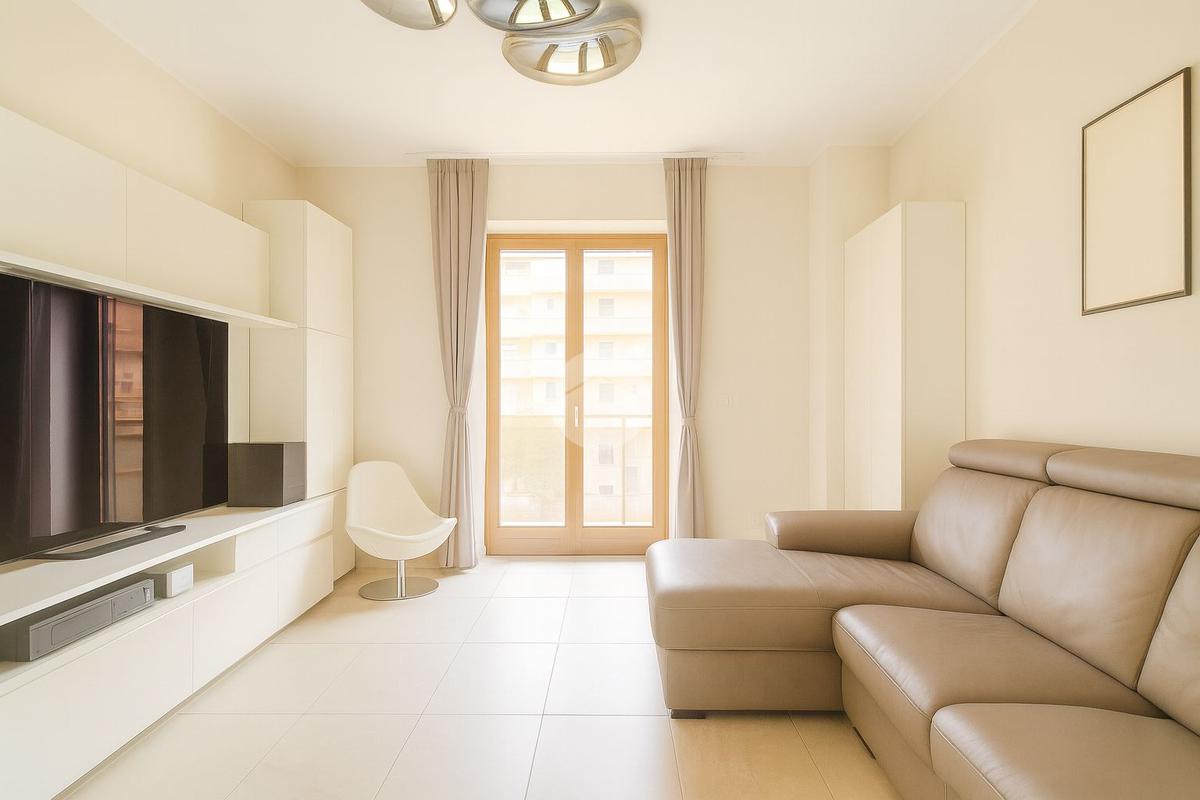 L'ingresso si apre sul soggiorno con balconata, proseguendo troviamo la cucina abitabile, un disimpegno con colonna lavanderia divide la zona notte composta da camera da letto matrimoniale, seconda camera da letto e doppi servizi di cui uno con la finestra.