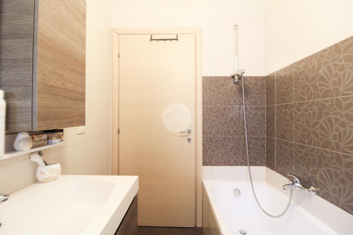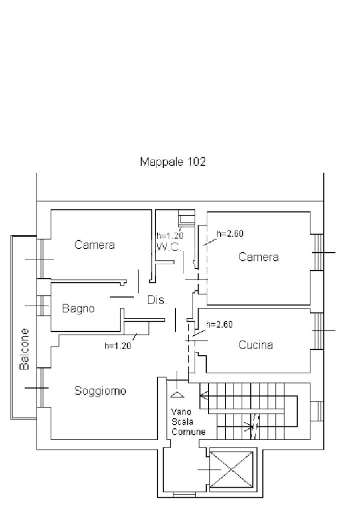 L'ingresso si apre sul soggiorno con balcone, proseguendo troviamo la cucina abitabile, un disimpegno con colonna lavanderia, camera da letto matrimoniale, seconda camera da letto singola e doppi servizi di cui uno con la finestra.
